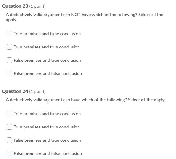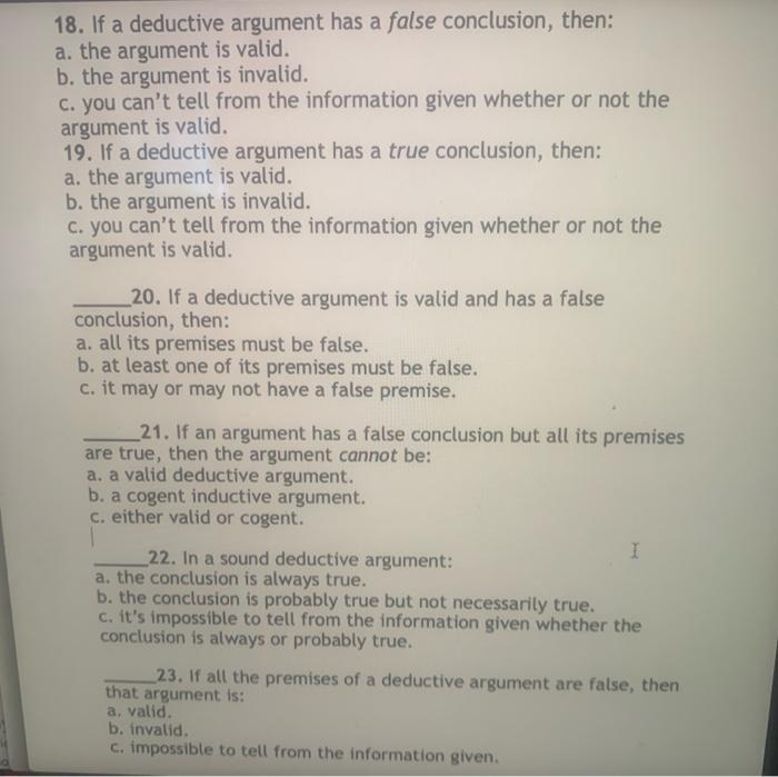 If the argument is inductive determine whether it is strong or weak. A deductively valid argument cannot have True premises and a false conclusion. A deductively valid argument cannot have.